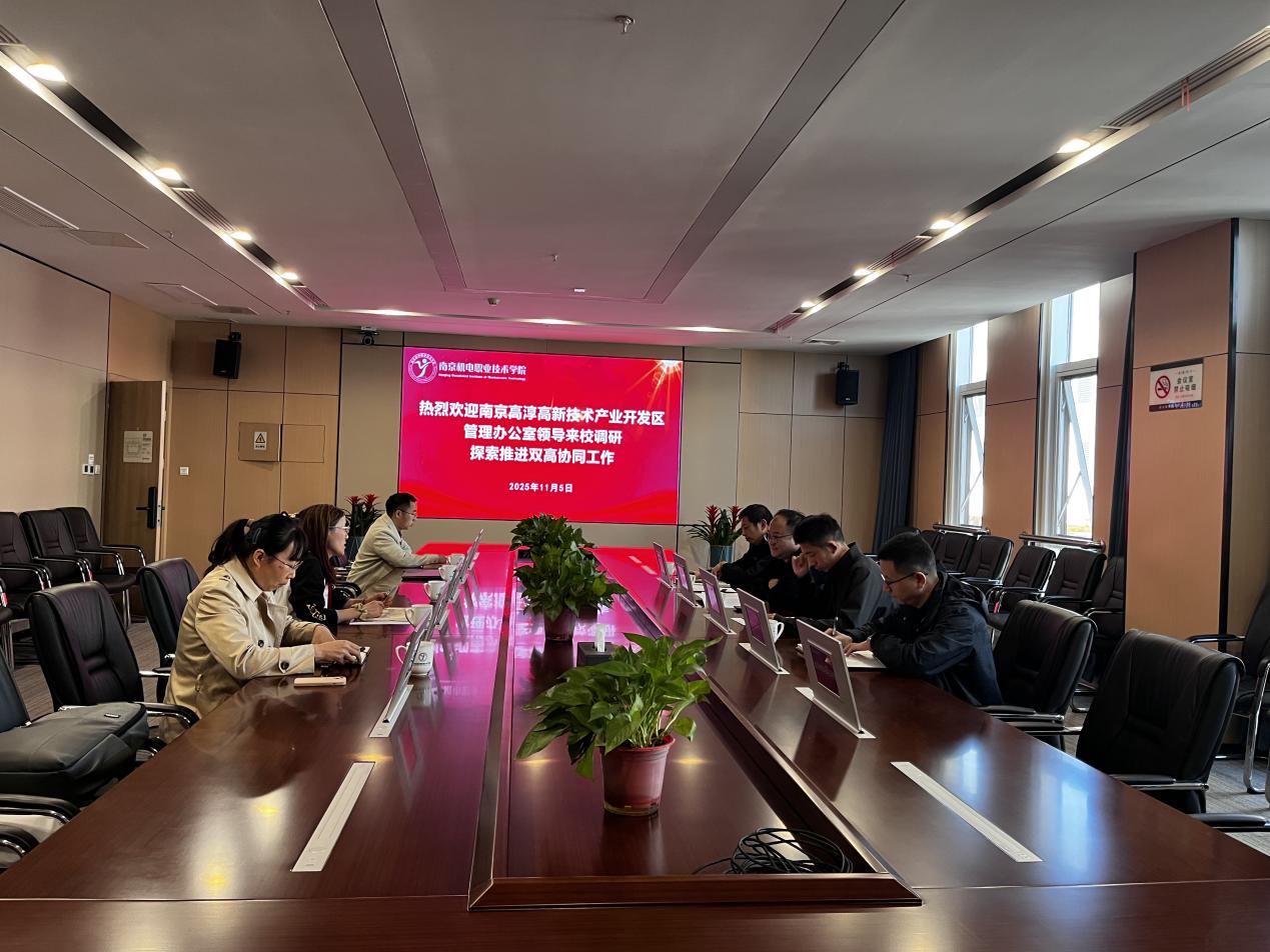 2025年11月5日,南京高淳高新技术产业开发区管理办公室主任孔振宇一行到访我们,开展探索推进双高协同工作的调研交流。学校党委委员、副校长刁爱军,科研及校企合作处处长李木香及专业负责人代表参加了本次交流活动。此次交流活动为双方后续深化合作奠定了坚实基础。