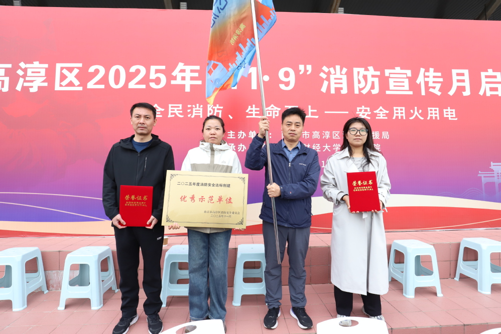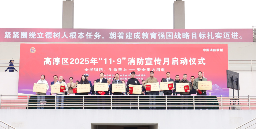 11月6日以 “全民消防、生命至上—安全用火用电” 为主题的高淳区2025年“119”消防宣传月启动仪式在南京财经大学红山学院举行。高淳区政府党组成员魏巍,应急管理局局长甘雨全,高职园管委会主任李强,总工会党组书记、常务副主席邓春燕,人社局副局长邢益松,媒体中心副主任刘明明,团区委副书记马俊,消防救援大队长孙震宁,消防救援教导员陈淑国和红山学院党委副书记、副院长王晨婷出席,区各镇街道分管负责人、消防重点单位代表、高职园高校代表、获奖单位和个人代表参加仪式。