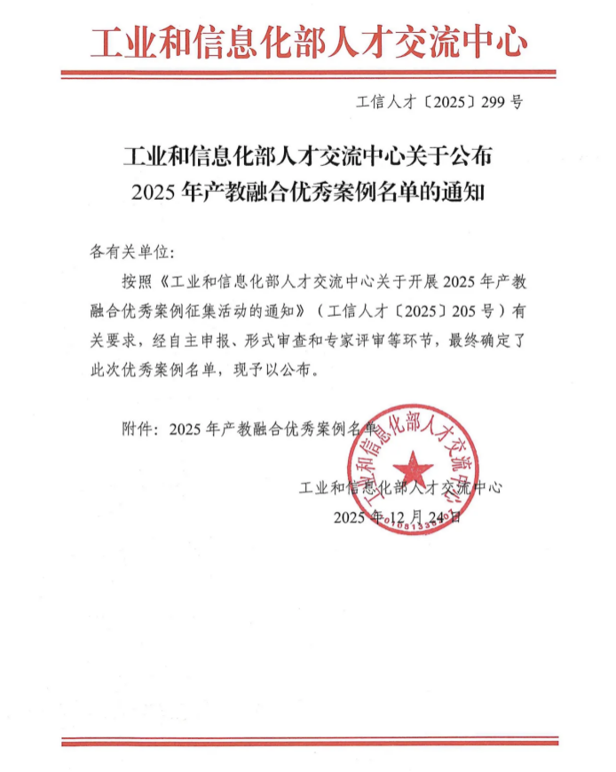 近日,工业和信息化部人才交流中心正式公布2025年产教融合优秀案例名单。我们与南京钢铁股份有限公司联合申报的《基于岗位能力图谱的“四力同向、五维融合”校企联合育人实践》项目,从全国众多案例中脱颖而出,成功入选。这标志着我们在深化产教融合、创新技术技能人才培养模式方面获得了国家部委的权威认可。