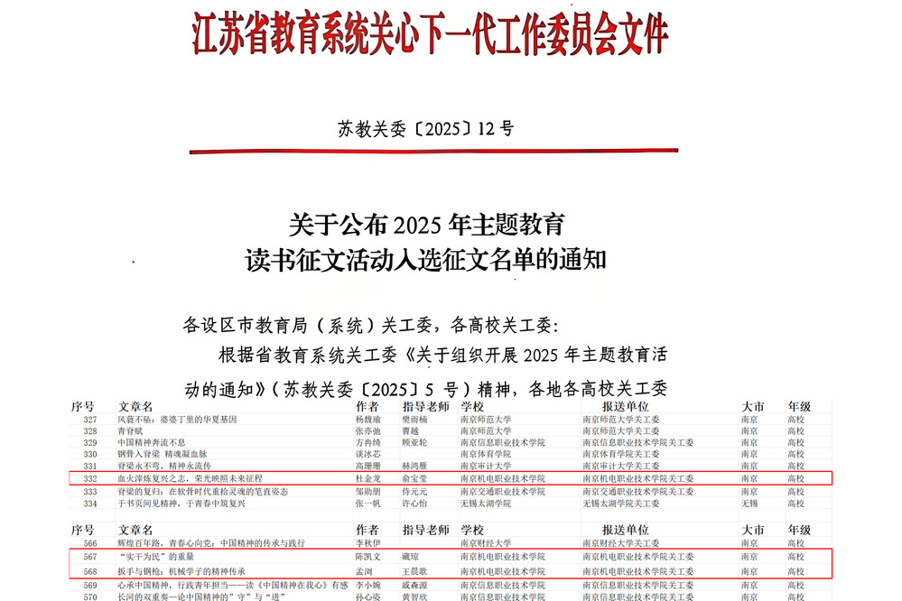 近日,江苏省教育系统关工委发布《关于公布2025年主题教育读书征文活动入选征文名单的通知》(苏教关委〔2025〕12号),我们在评选中喜获佳绩,荣获优秀征文1篇、入围征文2篇。