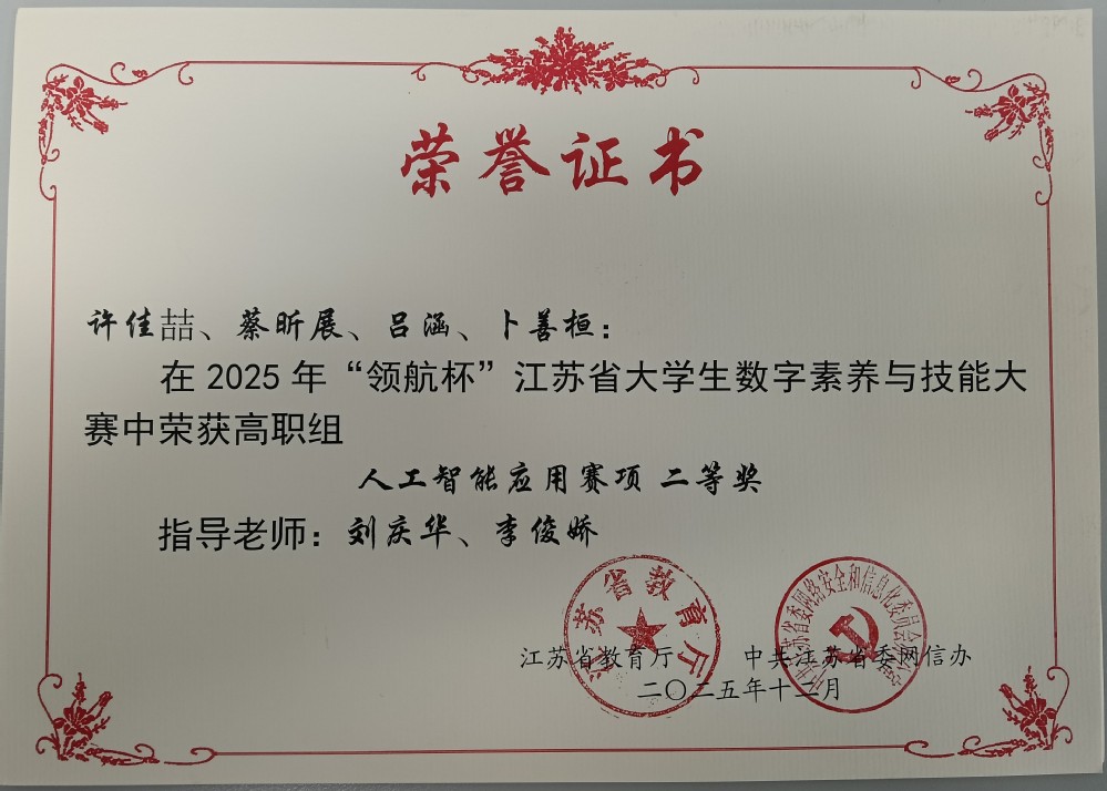 近日,由江苏省教育厅、中共江苏省委网信办联合主办的2025年“领航杯”江苏省大学生数字素养与技能大赛获奖结果正式公布,我们电子工程系许佳喆、蔡昕展、吕涵、卜善桓四位同学组成的团队,在刘庆华、李俊娇两位老师的悉心指导下,凭借“智能AI分拣系统”项目,历经线上赛项资料提交与视频展示的初赛选拔,最终在高职组人工智能应用赛项中脱颖而出,荣获二等奖,为学校赢得了荣誉!