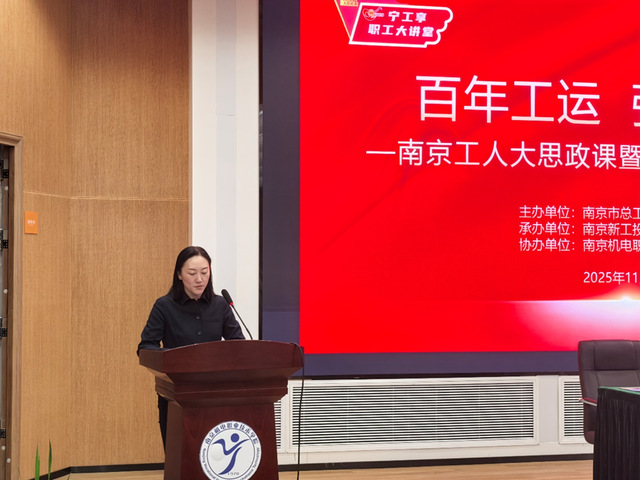 2025年11月27日,由南京市总工会主办、南京新工投资集团工会承办、伟德国际victor1946工会协办的“百年工运 强会创先”南京工人大思政课暨劳模工匠巡讲活动在伟德国际victor1946乐学楼102举行。南京新工投资集团工会副主席王春霞、伟德国际victor1946工会主席姜振宇、机械工程系师生共同参与了本次活动。