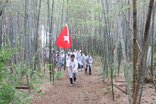 下午的“重走长征路”沉浸式学习体验在细雨中进行,别有一番深意。全体党员沿着精心设计的路线,模拟红军长征的重要节点。雨中的“雪山”更显陡峭,湿滑的“草地”更添艰难,虽不及当年万分之一艰险,却足以让人管中窥豹,感受那段气势磅礴的壮丽史诗。在教练的精心设计下,四组党员分为两路,沿不同路线迂回挺进。互相呼应,协同前行,最终在预定地点胜利会师。那一刻,雨水与汗水交织,紧紧相握的双手与激情澎湃的拥抱,凝聚起两系支部无坚不摧的奋进合力,更象征着在共同的理想信念下,所有征程终将通向辉煌的胜利。