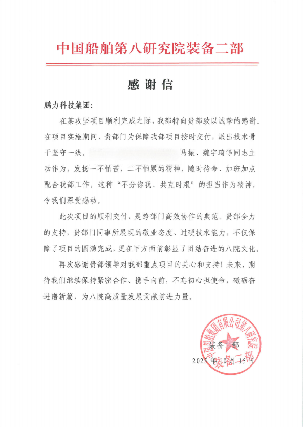 近日,中国船舶第八研究院装备二部给鹏力科技集团发来表扬信,表扬我们机械工程系工业设计232班马振、智能制造装备技术231班魏宇琦等同志主动作为,发扬一不怕苦,二不怕累的精神,随时待命、加班加点配合我部工作,这种“不分你我、共克时艰”的担当作为精神,令我们深受感动。感谢信原文如下: