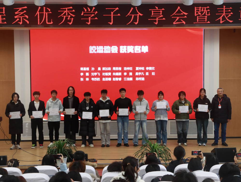 分享环节后,颁奖仪式有序开展,对各类先进集体与个人予以表彰鼓励。辅导员刘娜、谢珺为暑期社会实践优秀个人、优秀团队获奖代表颁奖;辅导员王潇然、余红志为校级奖学金获奖代表颁奖;系团委书记王晨歌、学工干事原智慧为三好学生、优秀学生干部及先进文明班集体获奖代表颁奖;系党支部宣传委员桑晶、纪律委员奚霞为入党积极分子培训班初级班优秀学员颁奖;系主任毛奇、党支部书记胡枫为在校运会中获奖的2024级学子颁奖;学校党委委员、副校长刁爱军为在校运会中获奖的2025级学子颁奖。获奖代表依次上台领奖,脸上洋溢着自豪与喜悦,现场氛围庄重热烈。