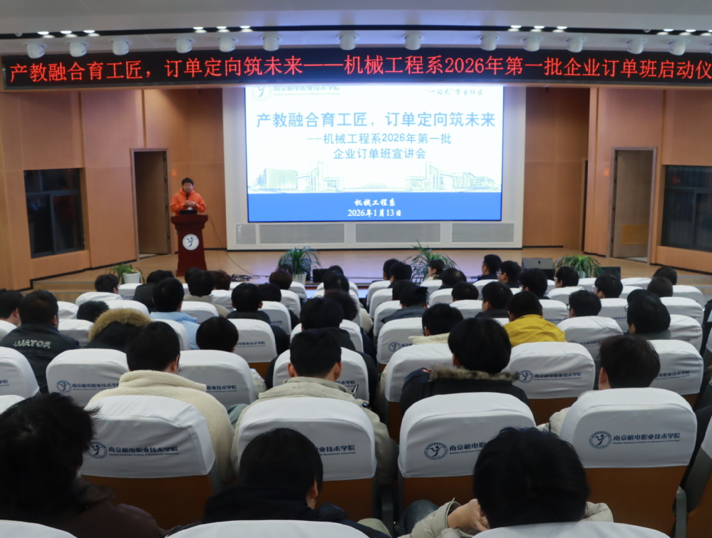为深入贯彻国家产教融合、校企合作政策,推动职业教育高质量发展,1月13日下午,机械工程系依托“一站式”学生社区在乐学楼102报告厅举办“产教融合育工匠,订单定向筑未来——机械工程系2026年第一批企业订单班启动仪式暨宣讲招聘会”。机械工程系主任毛奇、党支部书记胡枫、企业代表、24级辅导员代表及24级同学代表参加了本次活动。活动由机械工程系就业干事顾航主持。