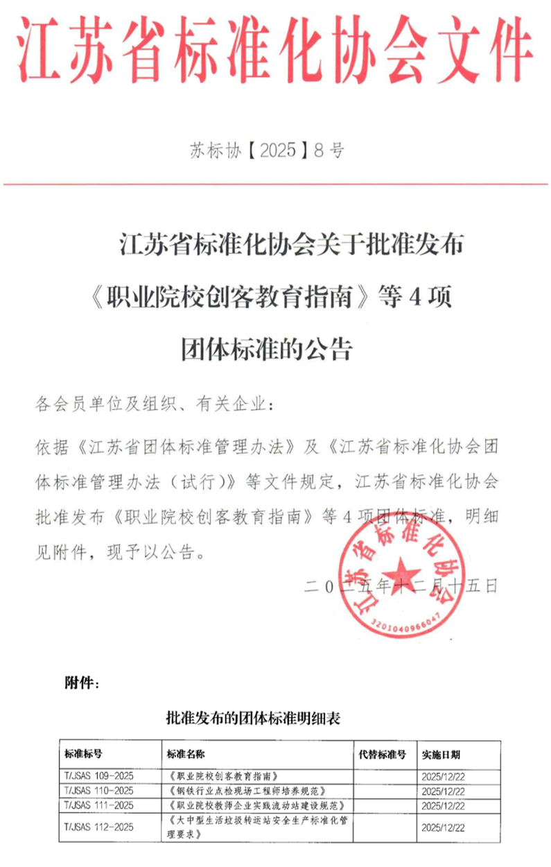 近日,江苏省标准化协会发布《关于批准发布<职业院校创客教育指南>等4项团体标准的公告》。由我们作为第一发起单位牵头研制《职业院校创客教育指南》《钢铁行业点检现场工程师培养规范》《职业院校教师企业实践流动站建设规范》三项产教融合团体标准正式发布,标志学校在产教融合与标准化建设方面取得重要突破。三项团体标准聚焦创新创业教育、现场工程师培养与职业院校教师实践能力提升等关键领域,系统总结学校在产教融合方面的成熟经验,形成可复制、可推广的规范化指引,将为全省乃至全国相关领域的发展提供重要参考依据。