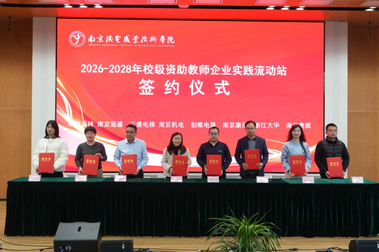 签约仪式上,刁爱军宣读了《关于公布2022-2025年教师企业实践流动站结项验收及2026-2028年复核认定结果的通知》。首批7个流动站全部通过结项验收,其中“南京机电-上海三菱电梯”等3个站点获评一类立项资助,“南京机电-康尼电气”等4个站点获评二类立项资助,标志着项目建设进入提质增效的新周期。现场,李木香与相关企业代表共同签署了新一轮校企合作协议,开启了未来三年深度合作的新篇章。