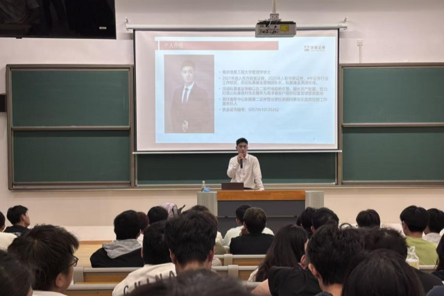 随后,苏展鹏聚焦金融科技应用领域,结合华泰证券的业务实际,为同学们讲解最前沿的金融科技应用知识。他从金融科技如何重塑证券交易模式,到大数据、人工智能在客户画像、风险评估等方面的深度应用,进行了细致且专业的阐述。同时,他还分享了自己在华泰证券担任团队长、私募基金渠道经理等岗位的工作经历,讲述了在这些岗位上如何运用金融科技知识开展业务、服务客户。
