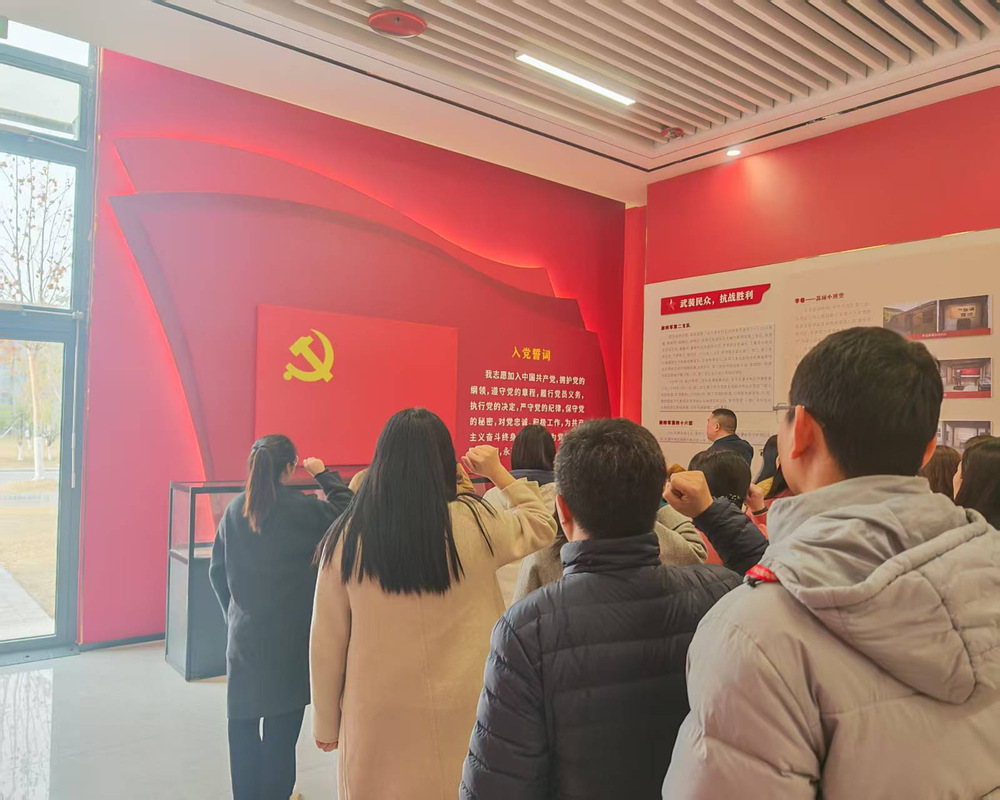 讲解结束后,庄严的重温入党誓词仪式随即开展。全体党员教师佩戴党员徽章,面向鲜红的中国共产党党旗,举起右拳,在领誓人的带领下庄严宣誓。“我志愿加入中国共产党,拥护党的纲领,遵守党的章程……” 铿锵有力的誓言回荡在展厅内,既是对入党初心的深刻回望,也是对使命担当的郑重承诺,进一步凝聚了党员教师的思想共识与奋进力量。