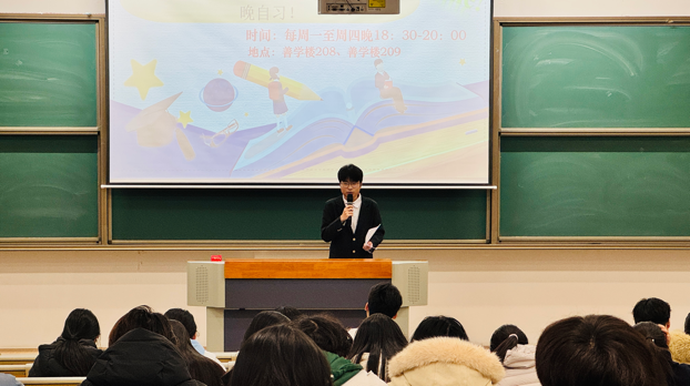 本次宣讲会率先聚焦晚自习与周读特色学习项目开展专项介绍与启动部署。余浩宇同学详细讲解“转本之家”晚自习的开展形式、时间地点与核心价值,覆盖英语四级、三级半及专转本英语备考,兼顾转本全科目学习需求,为学子升学备考筑牢基础。