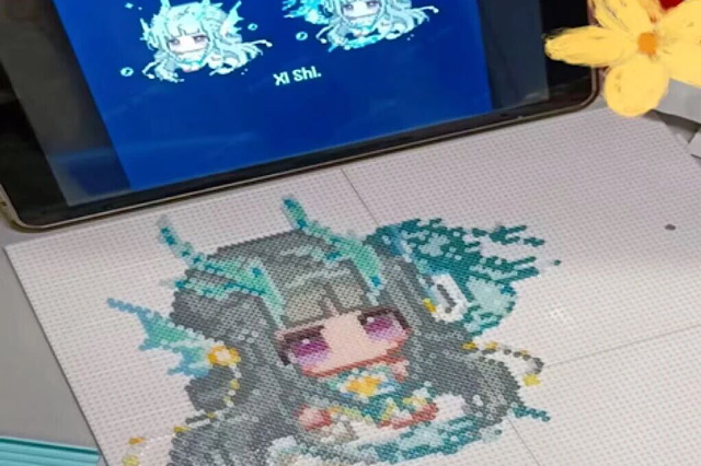 创作中,西施作品的创作者分享了核心技巧:先按角色轮廓分区域拆解拼接,用浅蓝、银灰豆粒逐层叠加打造头发渐变质感,再以白色豆粒点缀发梢高光,服饰部分则通过调整豆粒排列密度还原飘带褶皱感。