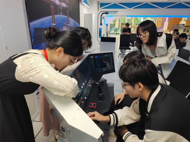 另一批人员则返回一楼卫星测控大厅,跟随卫星通信与导航技术专业教师陈诗媛,亲身体验火箭发射、卫星交会对接等模拟任务。通过互动操作,他们直观地感受到航天科技的精密与震撼。