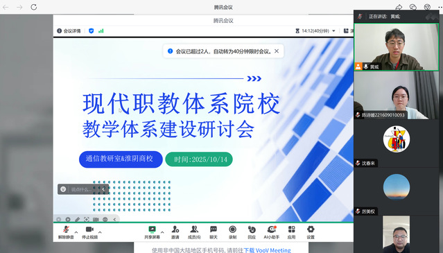 2025年10月14日,通信教研室组织开展教学体系建设研讨活动,特别邀请淮阴商业学校相关专业教师通过线上腾讯会议形式共同参与,围绕现代职教体系院校教学体系建设主题展开深入研讨。