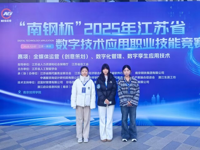 12月7日,2025 年江苏省“江苏工匠”岗位练兵职业技能竞赛全媒体运营(创意策划)赛项成功举办。学校信息工程系陈珑丹、施炜两位教师凭借扎实的专业功底和出色的实战能力,荣获职工组一等奖;学生李雨菡脱颖而出,斩获学生组一等奖,师生同台领奖,用亮眼成绩彰显了学校在数字技术应用人才培养领域的雄厚实力。