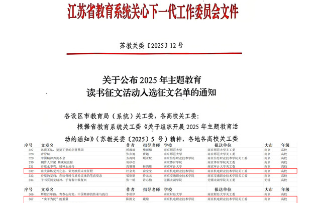 近日,江苏省教育系统关工委印发《关于公布2025 年主题教育读书征文活动入选征文名单的通知》(苏教关委〔2025〕12 号)。我们学子在此次评选中斩获佳绩,共有 1 篇征文获评优秀、2 篇征文获评入围。
