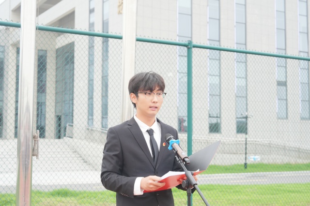 升旗仪式后,信息工程系学生会主席于方琦作为学生代表发言,他以自己的成长经历勉励新生。回忆起一年前刚入学时的青涩,于方琦坦言自己也曾面对专业课程的困惑,曾在实训室里手忙脚乱,但在老师指导和同学帮助下,通过不懈努力逐渐成长。从第一次写代码时连分号都会遗漏,到后来能独立完成项目;从面对设备不知所措,到熟练操作运用——这些成长正是'知行合一,自强不息'校训精神的生动体现。他鼓励新生要勇于尝试,不怕犯错,在实践磨练中收获成长。