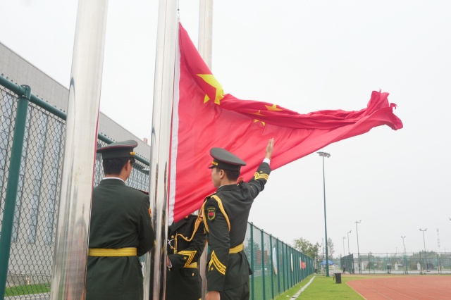 早晨7时40分,各连队在教官的指挥下有序入场,迅速整齐列队。8时整,升旗仪式正式开始。英姿飒爽的国旗护卫队迈着铿锵有力的步伐,护送五星红旗走向升旗台。在庄严的《义勇军进行曲》中,鲜艳的国旗冉冉升起,全体师生肃立行注目礼,齐声高唱国歌,展现了新时代机电学子昂扬向上的精神风貌。