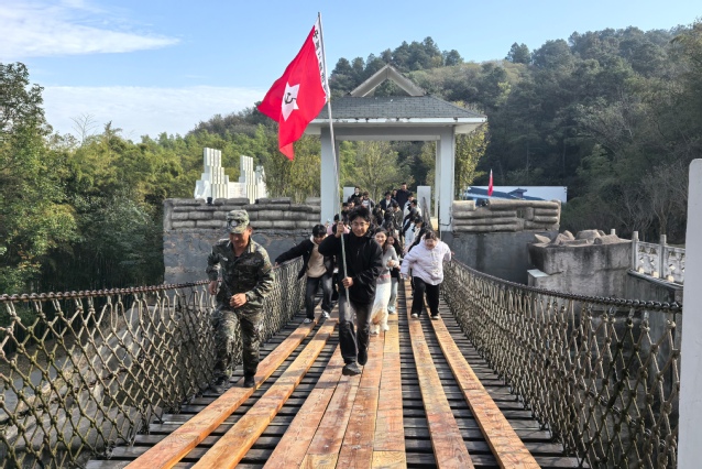 在“重走长征路”的沉浸式体验环节,同学们沿着模拟路线,亲身体验了长征途中的著名战役与艰难险阻。在模拟的“赤水河”畔,大家体会了“四渡赤水”中迂回机动的战术智慧;行走在摇曳的“铁索桥”上,下方“波涛”汹涌,亲身感受了飞夺泸定桥的惊心动魄;在攀爬陡峭的“雪山”路段时,相互扶持的身影,更是对革命先辈钢铁意志的无声致敬。前进途中,两校同学互帮互助,结伴而行。这场身体力行的实践,不仅是一次深刻的理想信念教育,更让同学们在并肩前行中结下了深厚友谊,为本次共建活动写下了生动注脚。