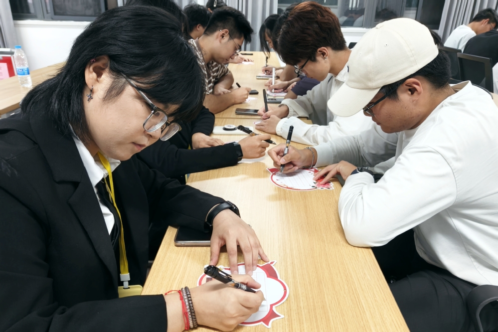 笔墨传情,师生共书担当。在主题书法活动环节,全体师生以“我和祖国共成长”“强国复兴有我”为创作核心,将满腔爱国情与报国志倾注于笔端。一幅幅风格各异、笔力遒劲的作品,既展现了师生共同的文化素养与精神风貌,也传递出“以青春之我,建设青春之中国”的坚定信念。