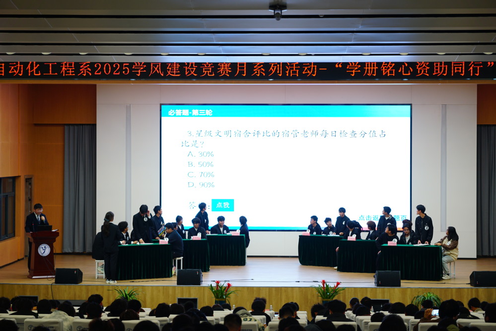 以赛促学强认知,以学促行守规矩。为帮助25级新生深入领会《学生手册》核心内容,筑牢规则意识根基,同时深化资助政策普及与宪法精神宣传,12月2日下午,自动化工程系2025学风建设竞赛月系列活动之“学册铭心・资助同行”知识竞赛系部复赛在乐学楼101报告厅圆满举行。